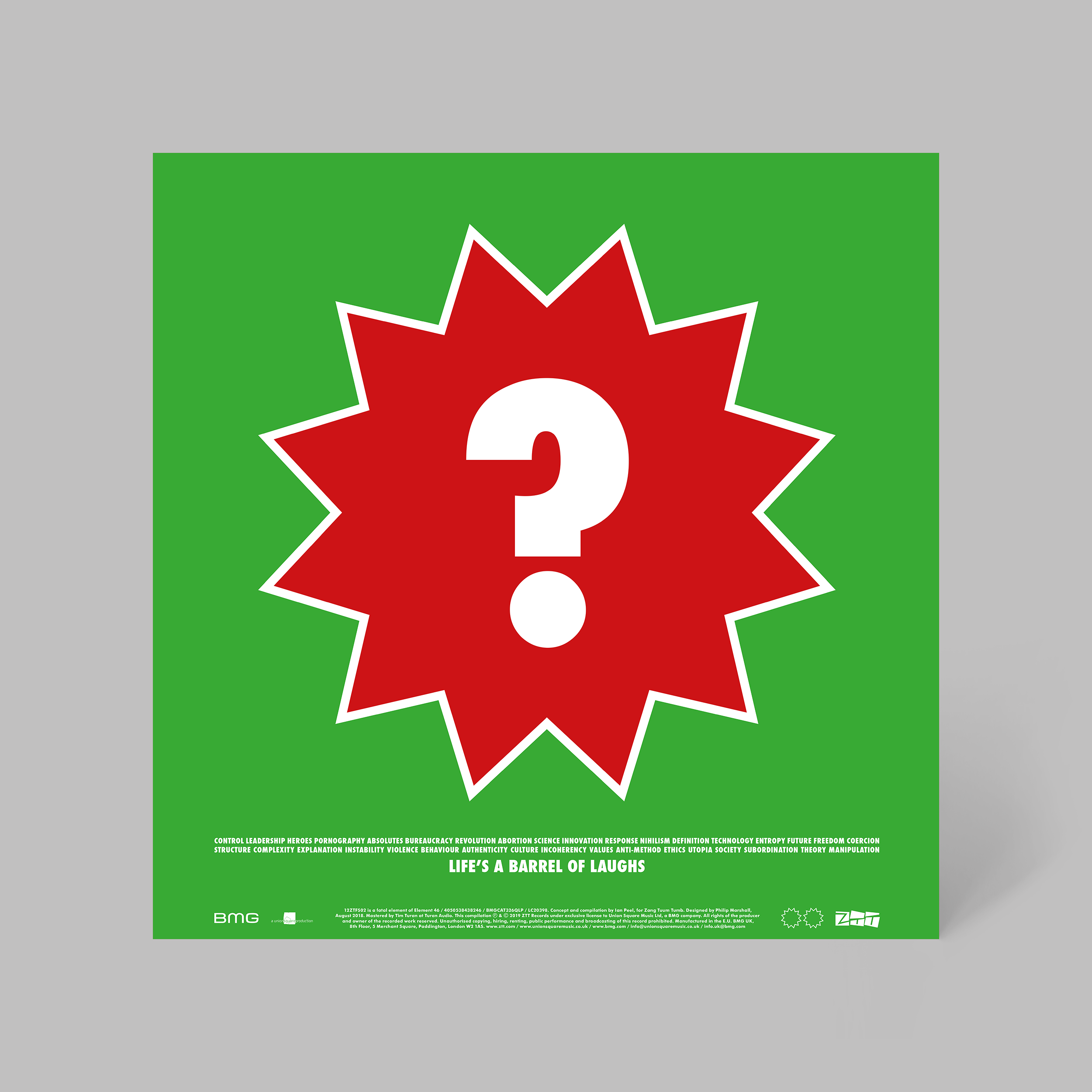 In keeping with Art of Noise’s early cover art, which would feature futurist and dadaist quotes, Ian presented me with a suitably wordy brief. I responded with a design which honoured those editions. For the final 12” of the set, I referenced one of the titles: ‘Yes or No’ – ! or ?; green or red.