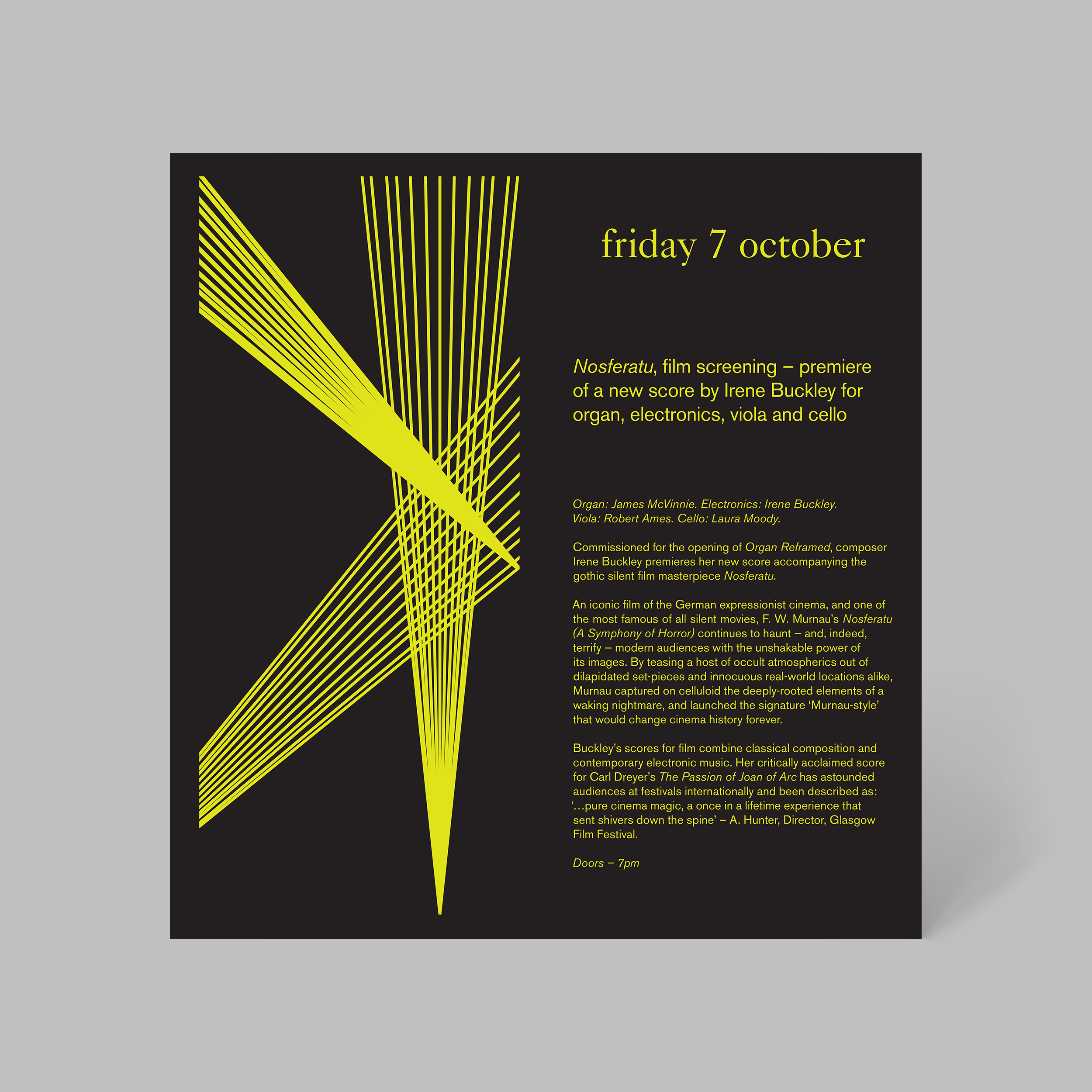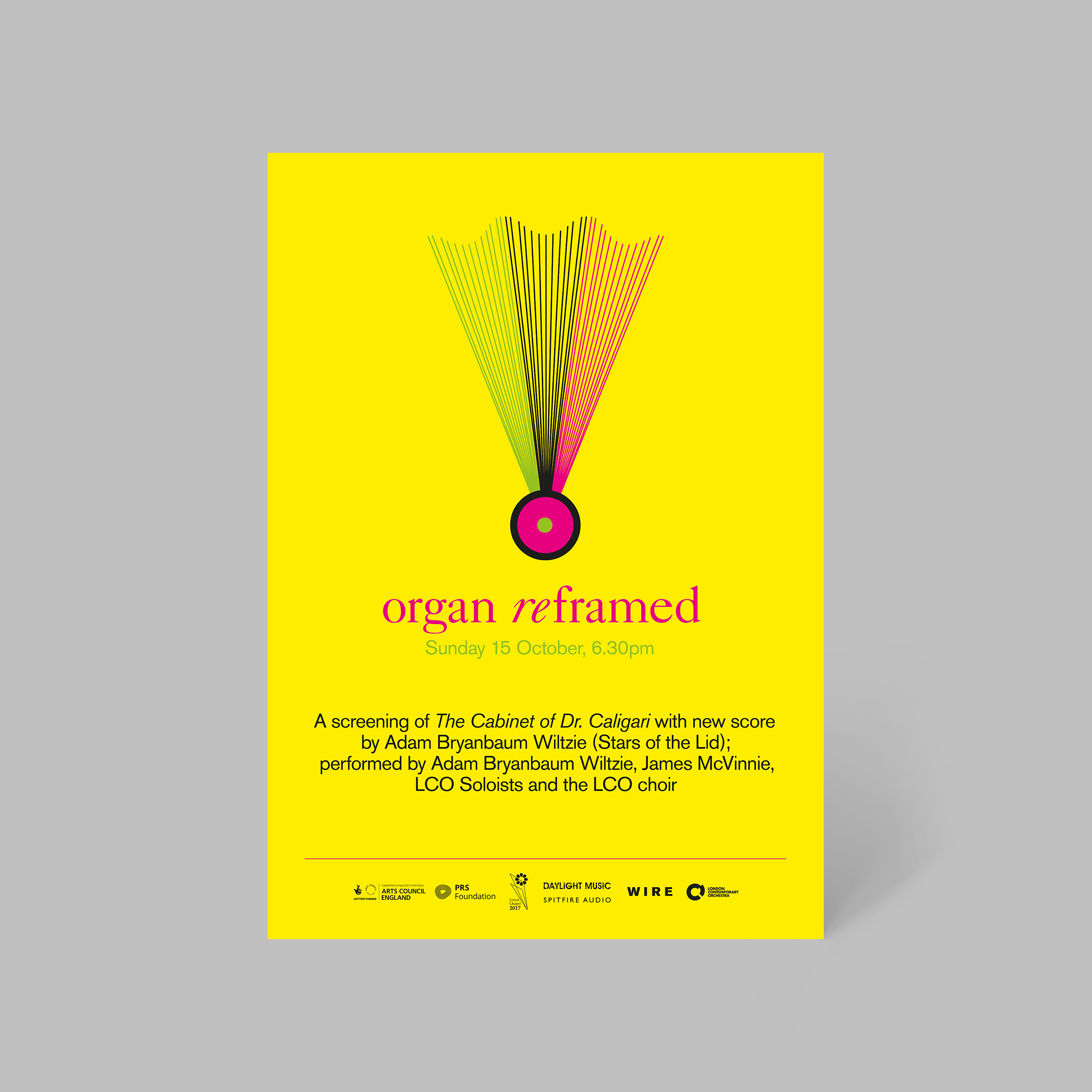 Claire approached me to create the festival’s identity, which I based on diagrams of the organ’s pipes. For each season I have designed a series of promotional materials including posters, flyers, large-format banners, digital adverts, projection screens, T-shirts and brochures. The festival’s lighting design picks up on the colour themes chosen for each year.
