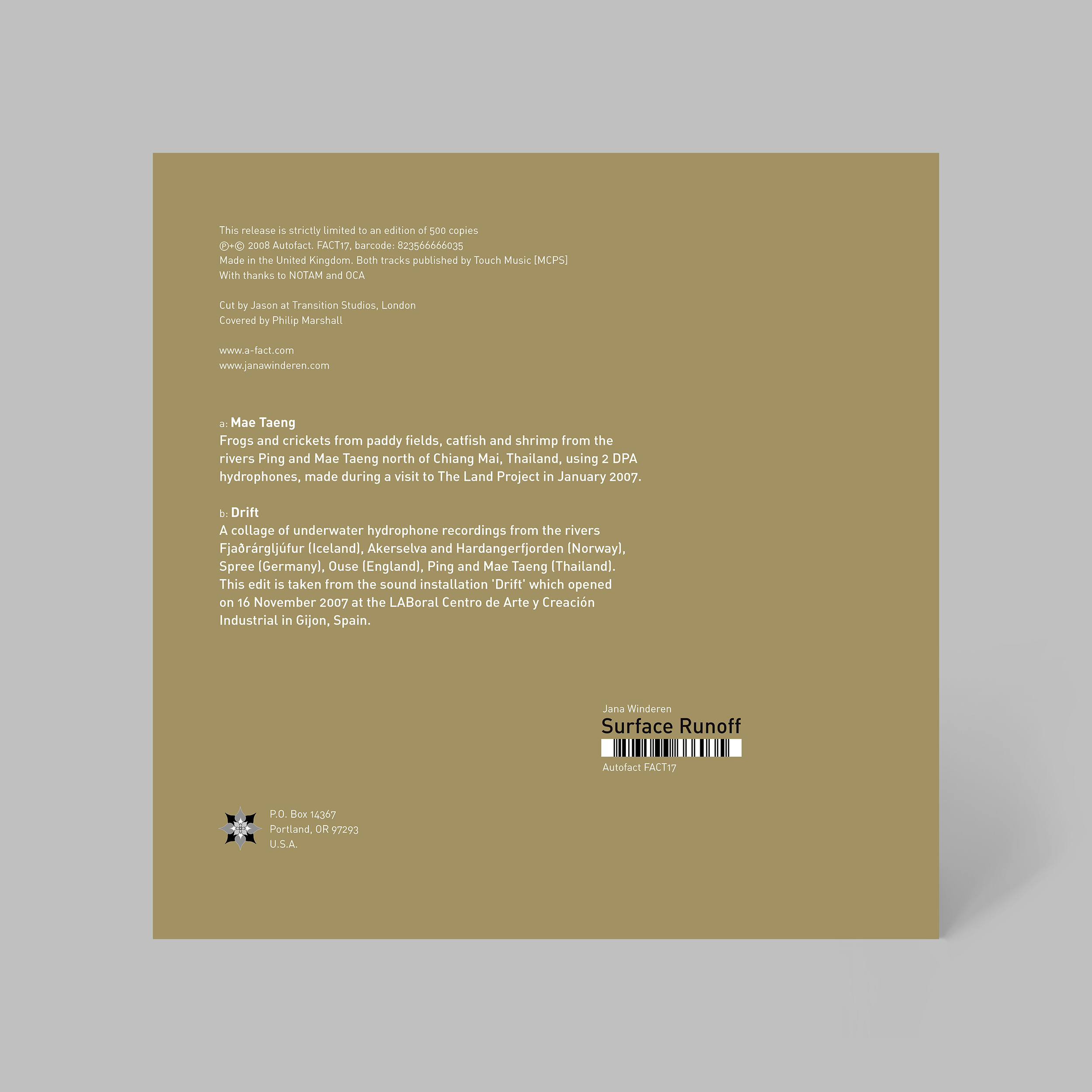 This limited edition 7” single, released by Portland-based label Autofact, was our first project working together. The A-side documents frogs and crickets from paddy fields, catfish and shrimp from the rivers Ping and Mae Taeng north of Chiang Mai, Thailand, captured by Jana using two DPA hydrophones in January 2007. Jana supplied the beautiful cover image, shot on location.